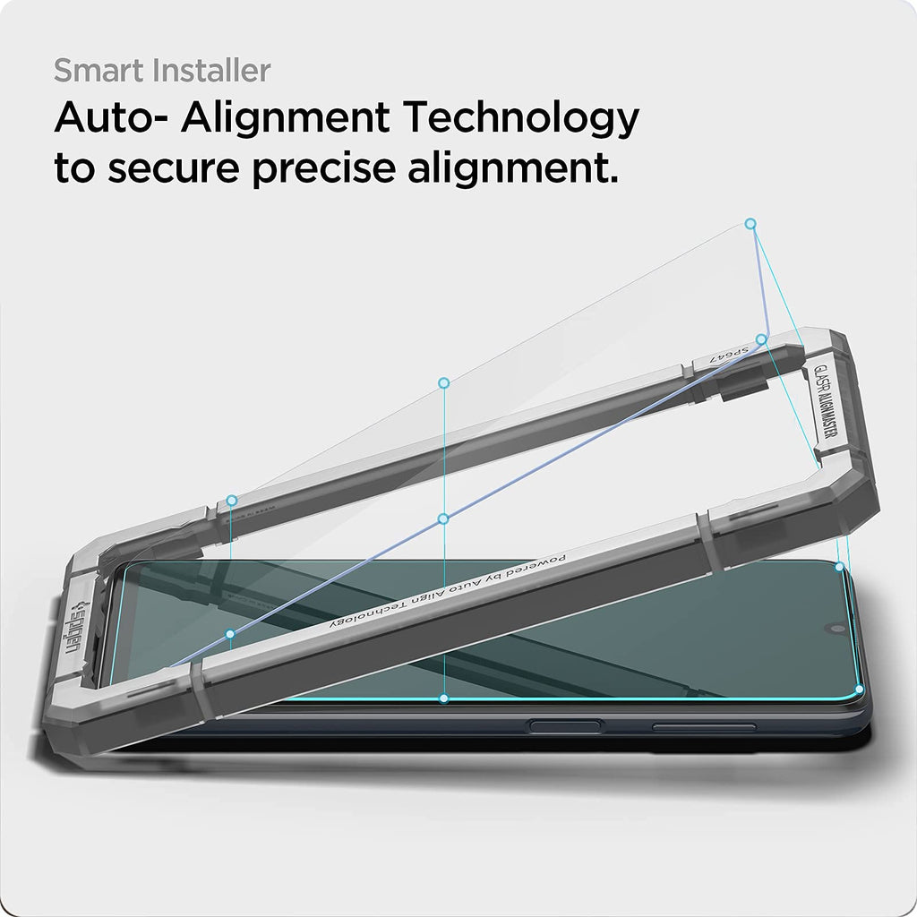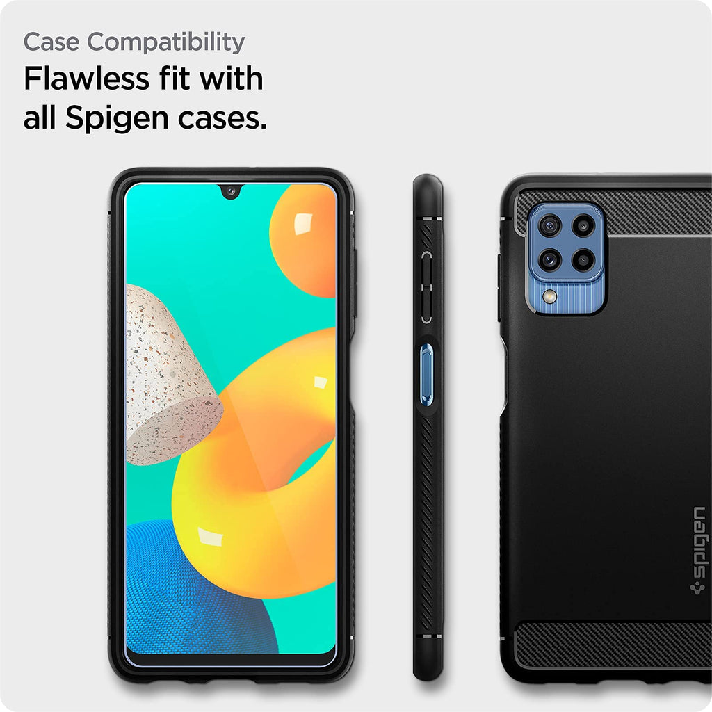 Compatibility ; Glass Screen Protector Compatible with Galaxy M32 Auto-Align Technology ; Engineered for a perfect and easy installation. Allows to put a glass in the right place with the alignment tool Crystal Clear ; Extreme clarity preserves the original screen brightness Case friendly ; Made case compatible with Spigen case Oil-free ; Oleophobic coating for daily fingerprint resistance