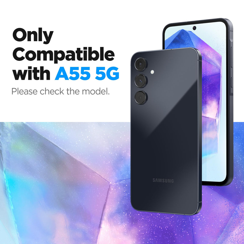Compatibility ; Glass Screen Protector Compatible with Galaxy A55 5G Auto Align Technology ; Ensures edge to edge precision with the alignment frame Case friendly ; Made case compatible with Spigen case 9H Hardness ; Tempered glass durability rated at 9H hardness to protect from everyday scratches Oil-free ; Oleophobic coating for daily fingerprint resistance